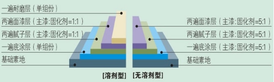 1.使用溶剂型环氧面漆(1:1)或无溶剂型环氧面漆(5:1)按比例混合,搅拌均匀; |
