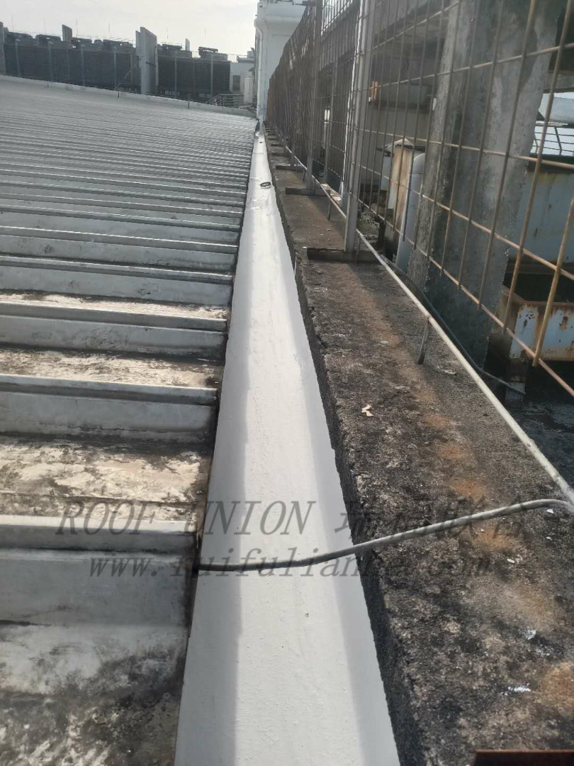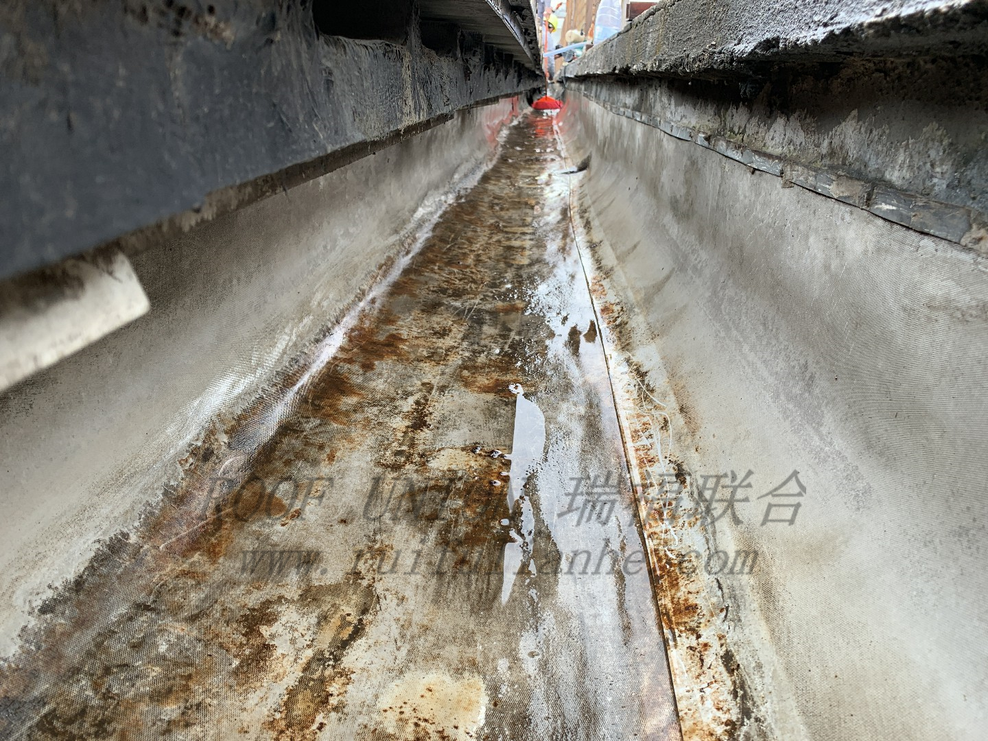 富士康科技集团观澜厂区是深圳主生产厂区之一,该厂区钢构厂房屋面两条排水沟长达300米,多年前用PVC防水卷材进行整体防水施工,经长时间使用后,原PVC防水卷材层多处焊接缝出现脱胶、开裂情况,雨水渗入到卷材层内部,最后渗入到厂房内,对车间生产造成严重的安全隐患。