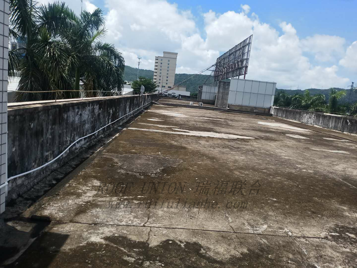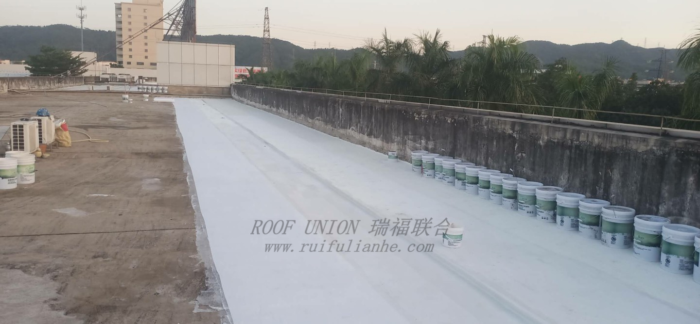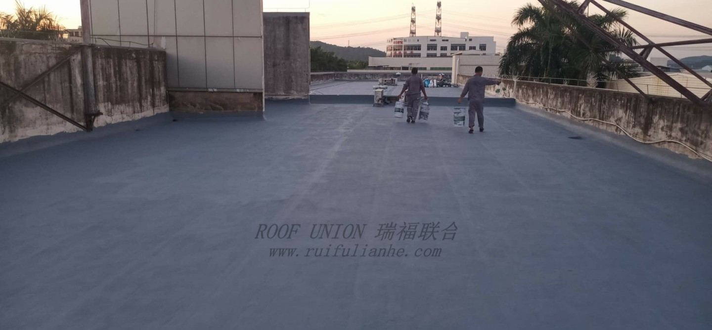 随后针对破损处用高标号水泥沙浆进行修复,再对屋面整体采用瑞福联合RFN-HR01+RFN-RM01无缝隙防水系统进行施工;