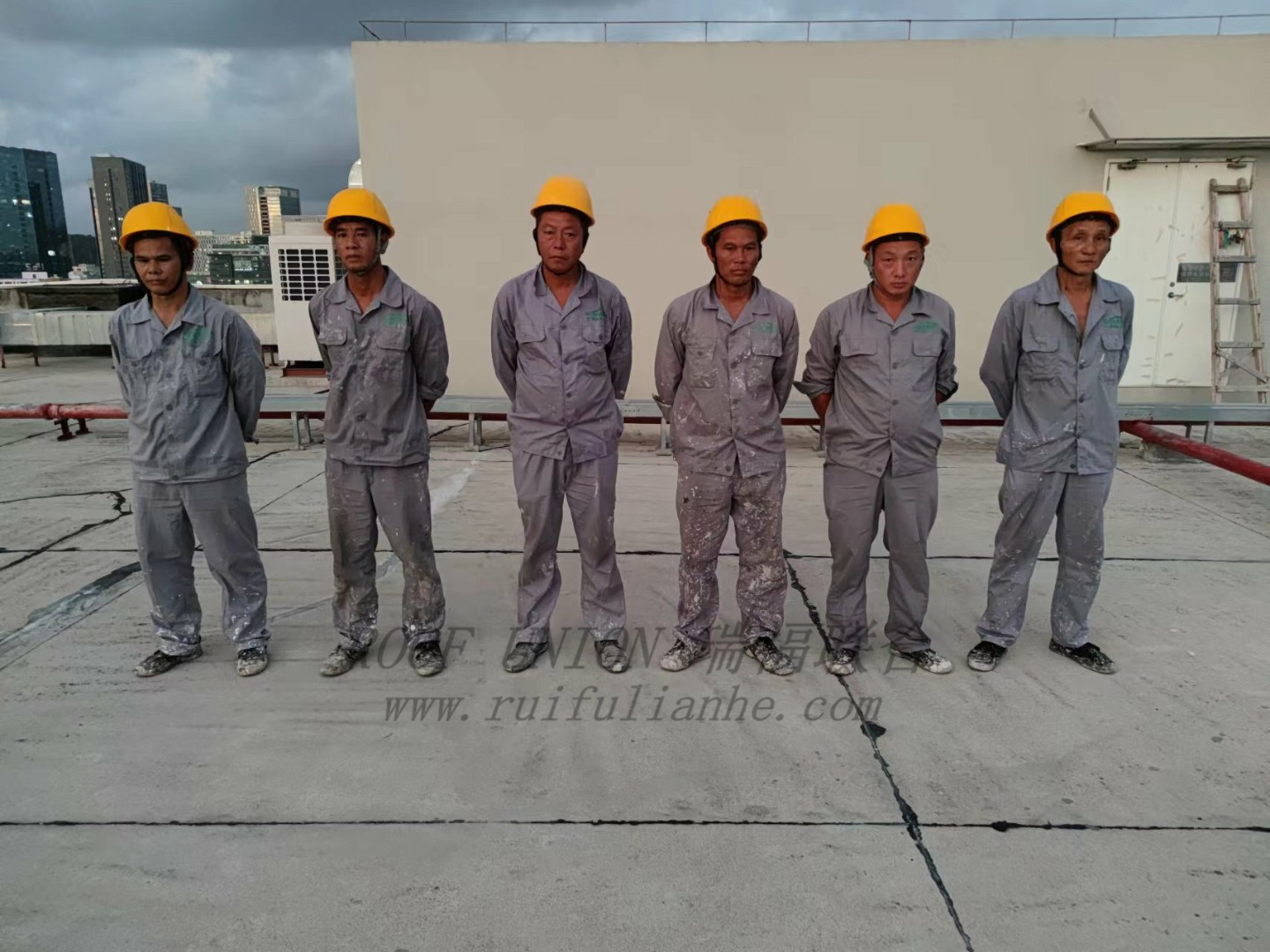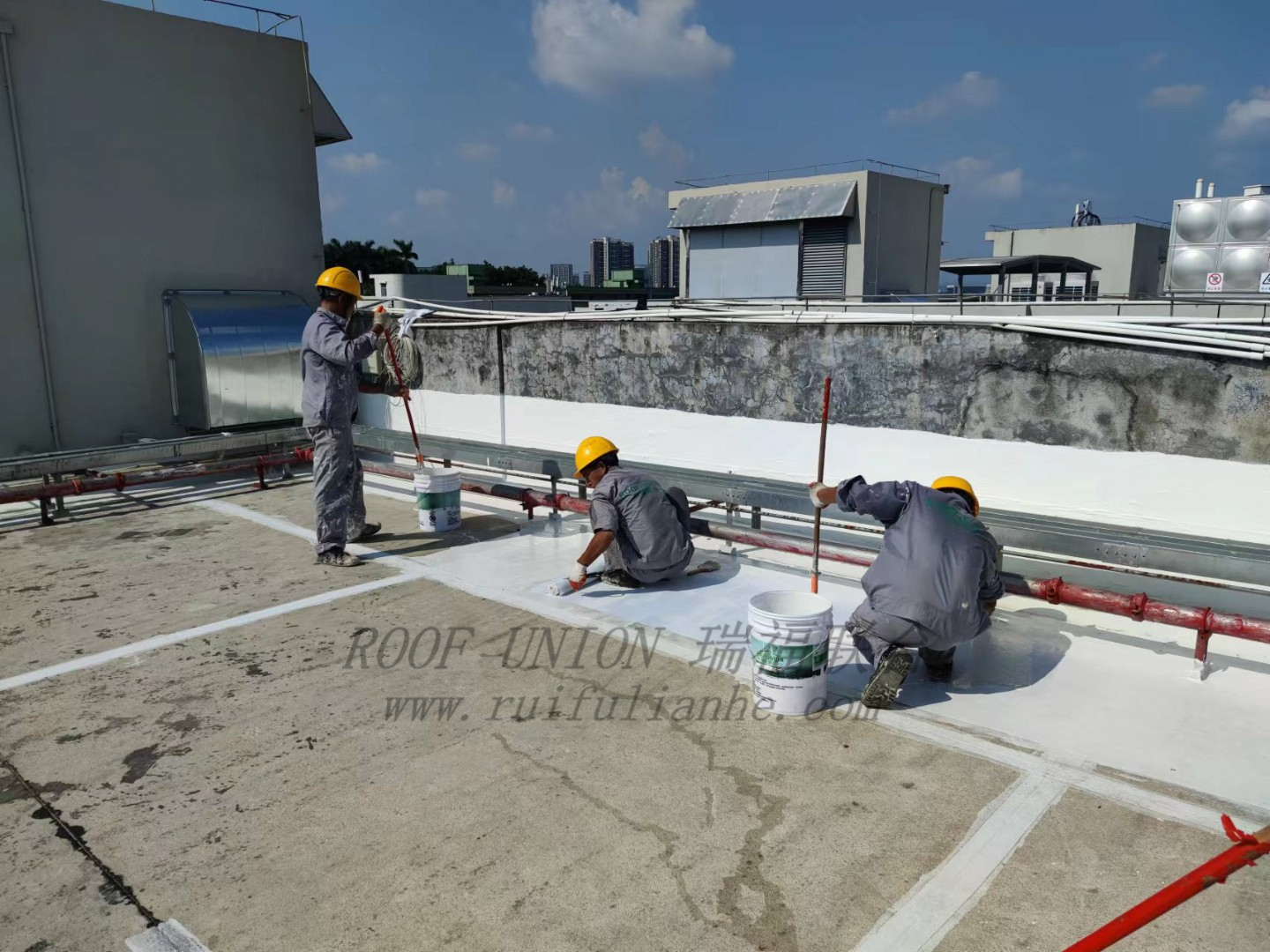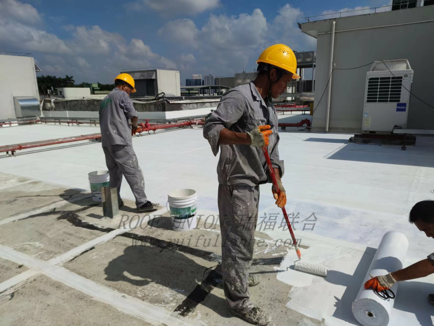 随后针对破损、开裂处用水泥沙浆进行修复,再对屋面整体采用瑞福联合RFN-HR01+RFN-RM01无缝隙防水系统进行施工。