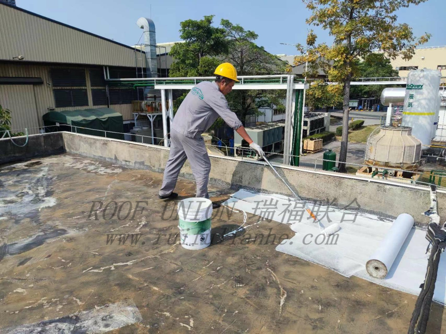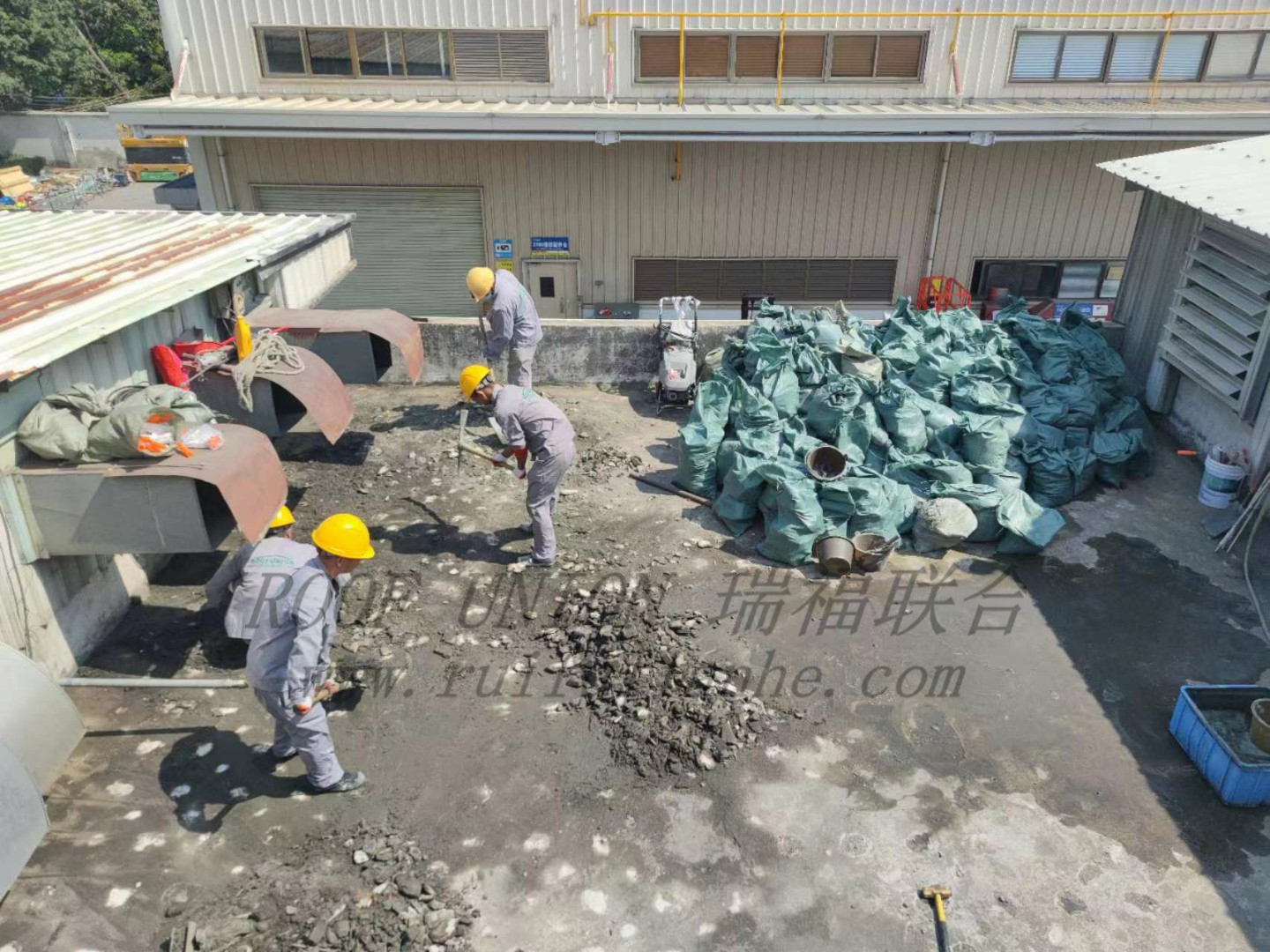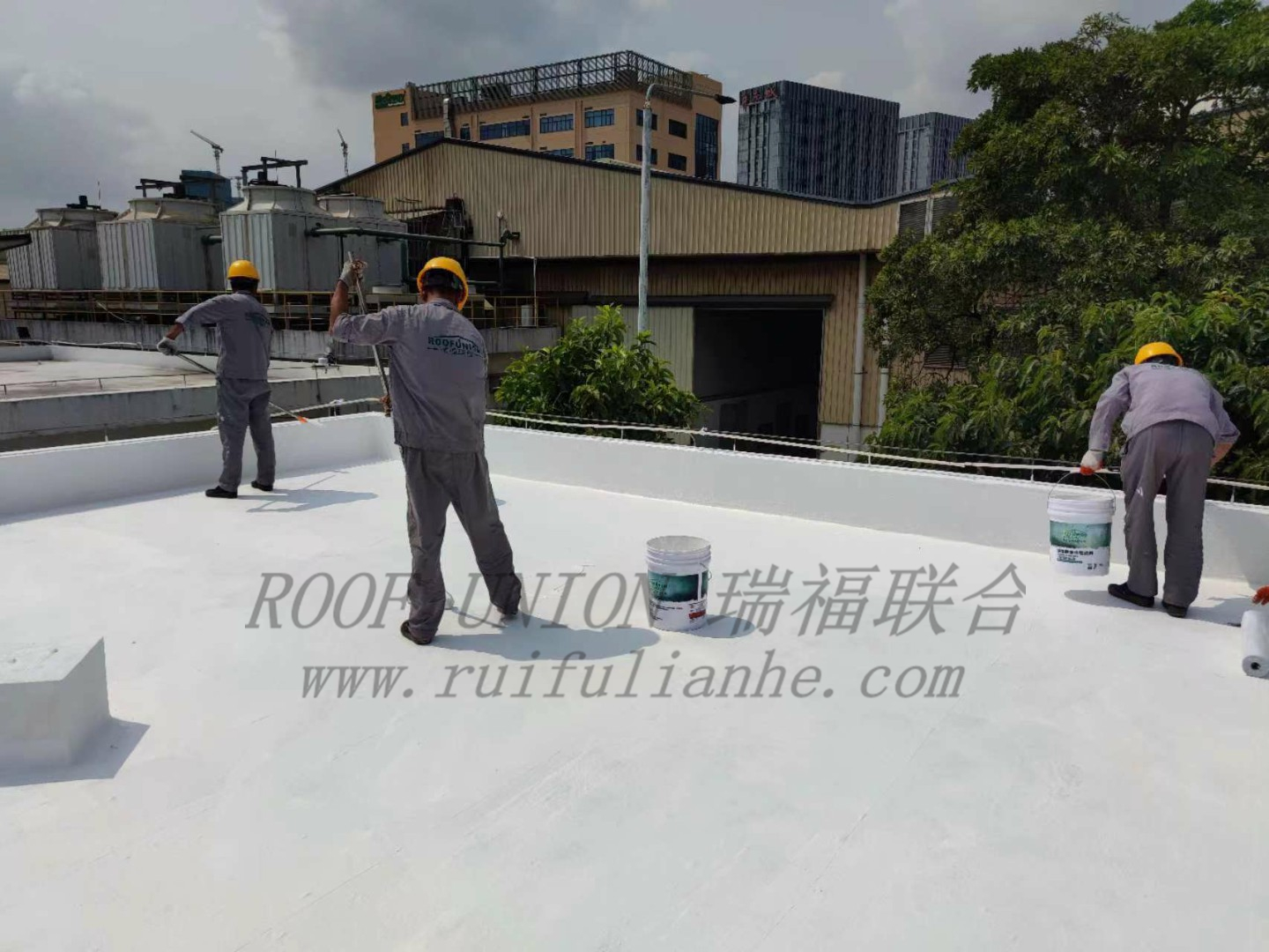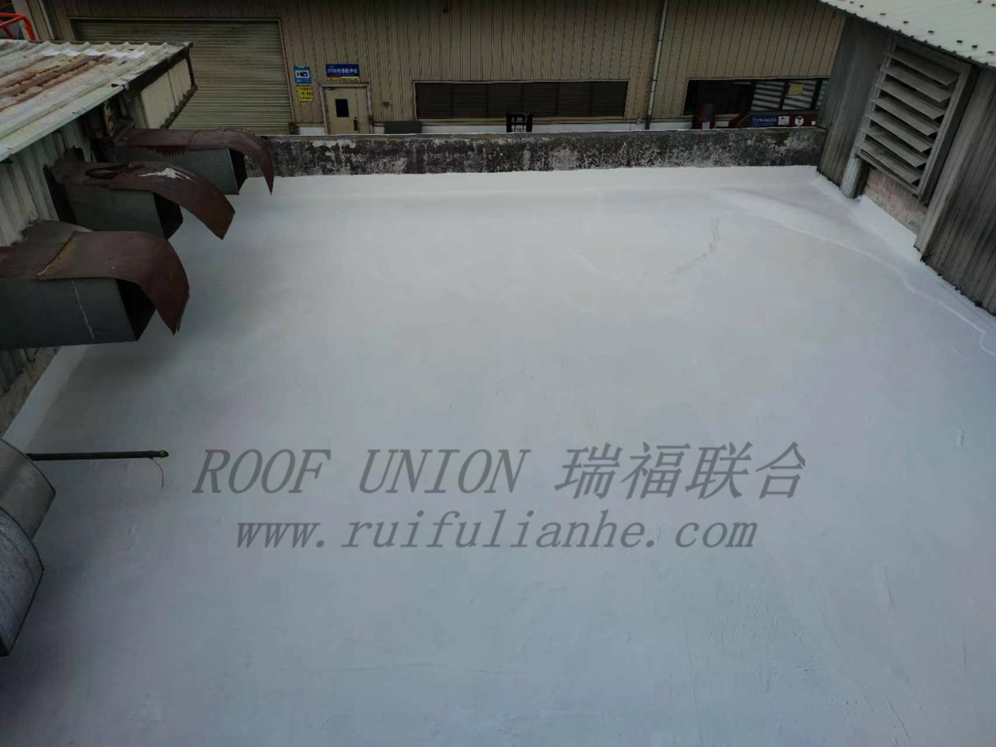 随后针对破损、开裂处用水泥沙浆进行修复,再对屋面整体采用瑞福联合RFN-HR01+RFN-RM01无缝隙防水系统进行施工。