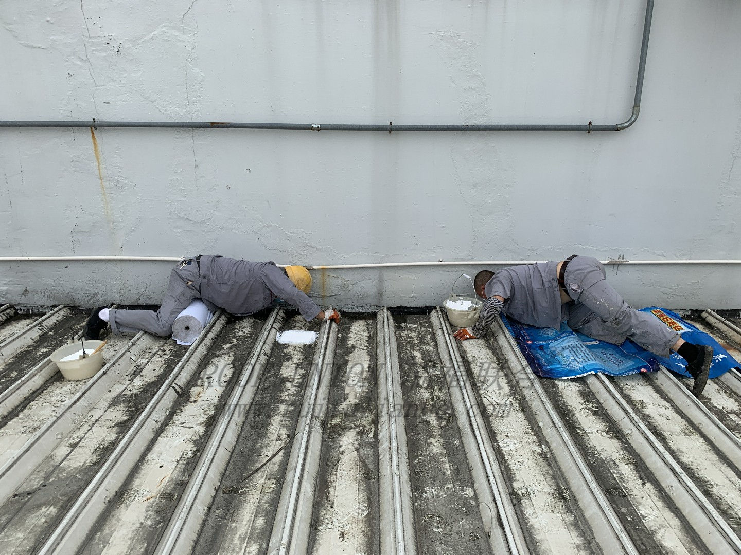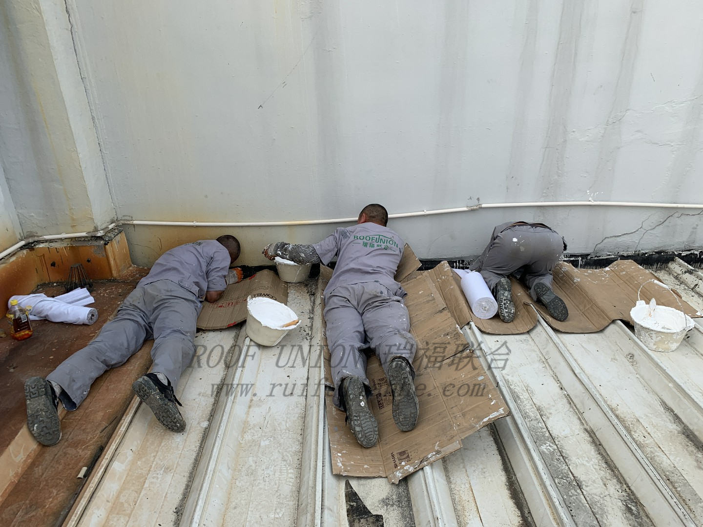 由于屋面排水沟施工作业面有限,天沟的深度又达到40公分以上,为确保将防水层铺设完整,瑞福联合施工团队全程匍匐在屋面上施工。烈日炎炎,屋面板温度高达60度,施工团队不得不将纸箱铺在身下进行隔热。局部特别难施工的排水沟,施工人员甚至要将头部下探到排水沟内,施工难度已经达到极限。