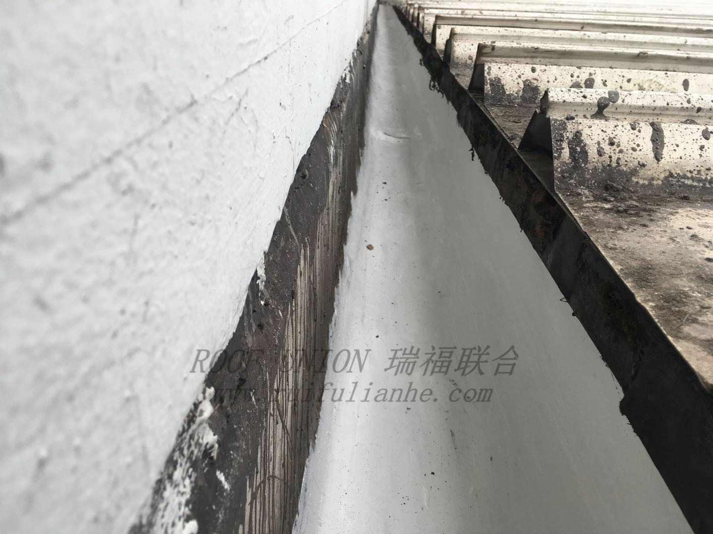 富士康科技集团观澜厂区是深圳主生产厂区之一,该厂区钢构厂房屋面两条排水沟长达300米,多年前用PVC防水卷材进行整体防水施工,经长时间使用后,原PVC防水卷材层多处焊接缝出现脱胶、开裂情况,雨水渗入到卷材层内部,最后渗入到厂房内,对车间生产造成严重的安全隐患。