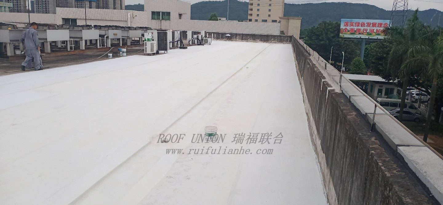 随后针对破损处用高标号水泥沙浆进行修复,再对屋面整体采用瑞福联合RFN-HR01+RFN-RM01无缝隙防水系统进行施工;