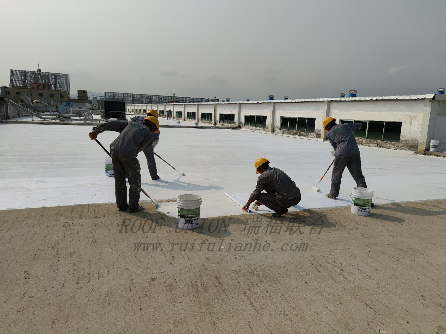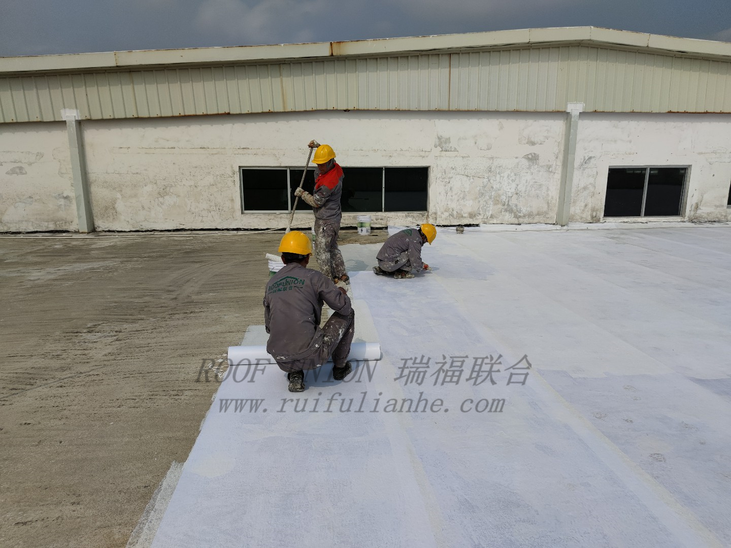 随后针对破损、开裂处用水泥沙浆进行修复,再对屋面整体采用瑞福联合RFN-HR01+RFN-RM01无缝隙防水系统进行施工。