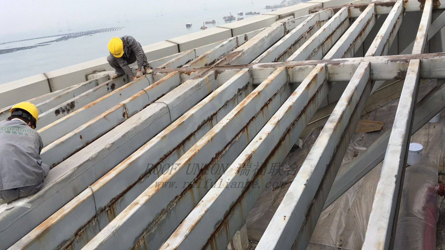 面对腐蚀严重的钢结构主体(整体腐蚀率达到70%以上),瑞福联合采用独特的免除锈防腐翻新施工工艺,使用瑞福联合品自主生产的高性能水性防腐涂料,施工工艺为两层防腐底涂,两层防腐面涂,既节省了大量打磨腐蚀基层的人工成本,极大提高了施工效率,同时又圆满的解决了原腐蚀主体进一步腐蚀问题。