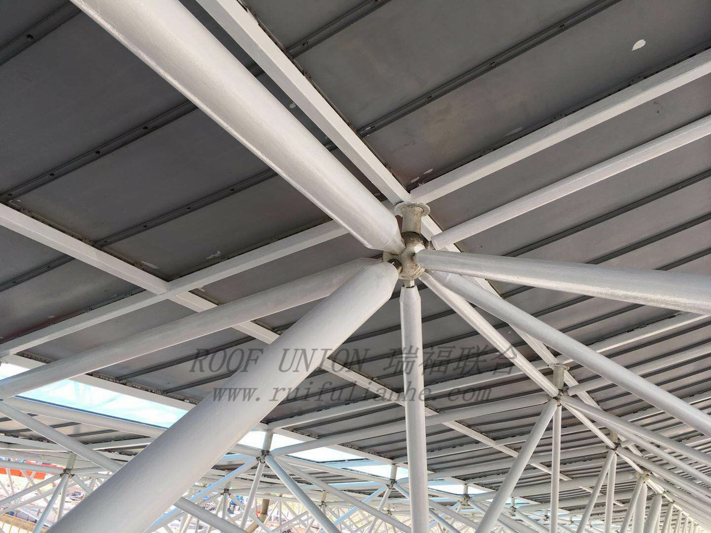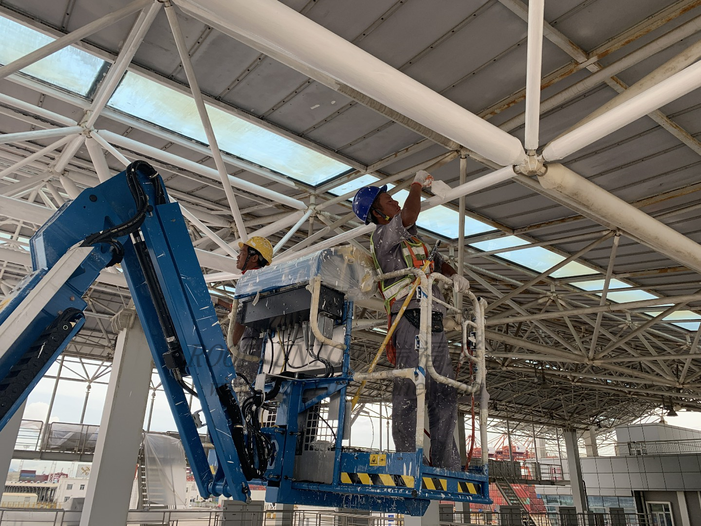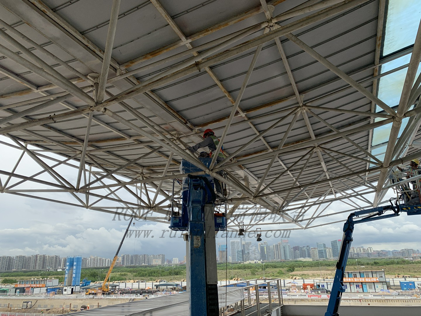 面对腐蚀严重的钢结构主体(整体腐蚀率达到70%以上),瑞福联合采用独特的免除锈防腐翻新施工工艺,使用瑞福联合品自主生产的高性能水性防腐涂料,施工工艺为两层防腐底涂,两层防腐面涂,既节省了大量打磨腐蚀基层的人工成本,极大提高了施工效率,同时又圆满的解决了原腐蚀主体进一步腐蚀问题。