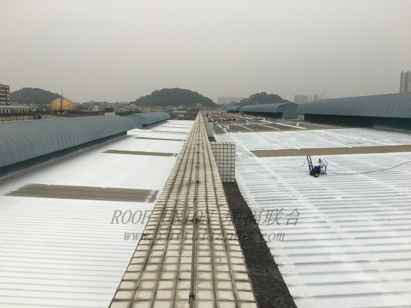 2.2屋面防水施工采用的是我公司特有的四涂一布工艺,在屋面漏水的隐患处如采光窗两侧、螺钉、横接缝处进行防水处理;防腐施工首先用德国进口高压水枪对屋面进行清洗,然后逐步喷涂两遍底漆,一遍面漆,确保10年内不出现返锈问题;