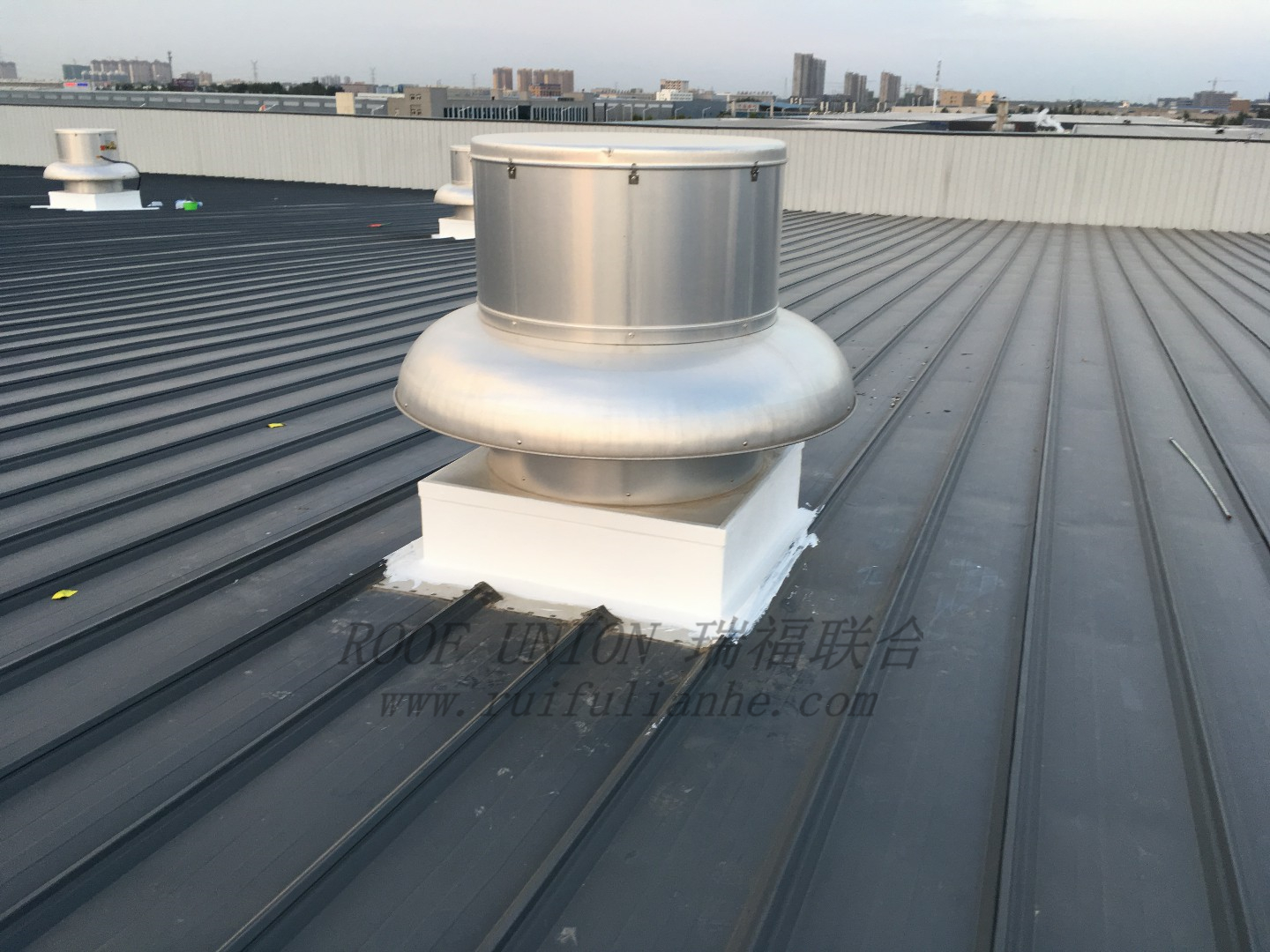 由于屋面风机安装在屋面顺坡方向上,为了安装需要在钢结构屋面上预留洞口。在屋面的预留洞口顺坡方向的迎水面,造成上坡的雨水在往下边流淌的过程中产生阻碍,在风机预留洞口接缝的上端形成积水,积水不能轻易排除从而造成漏水,影响厂房内部的使用。