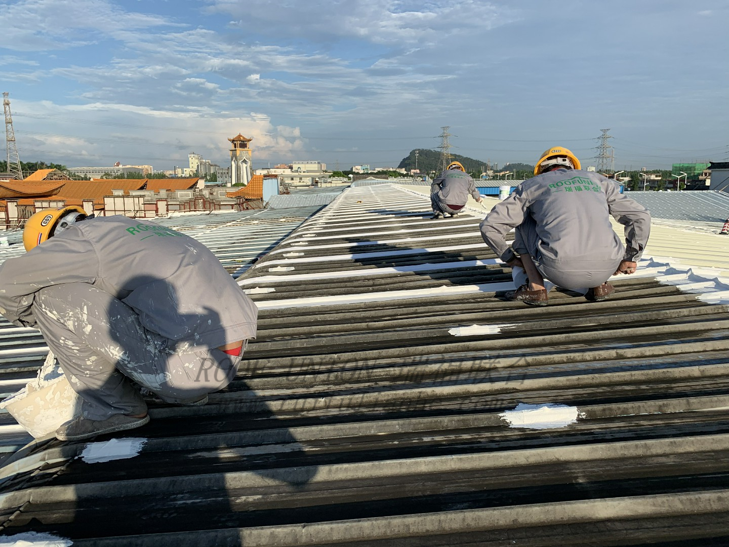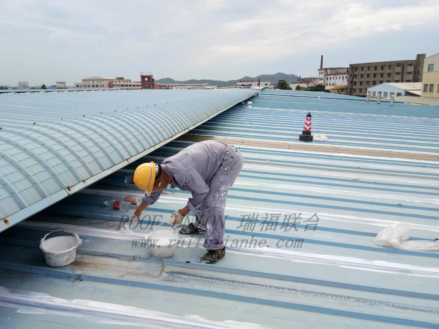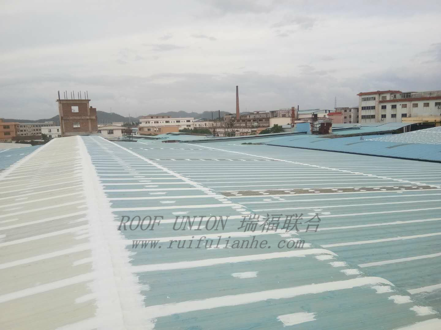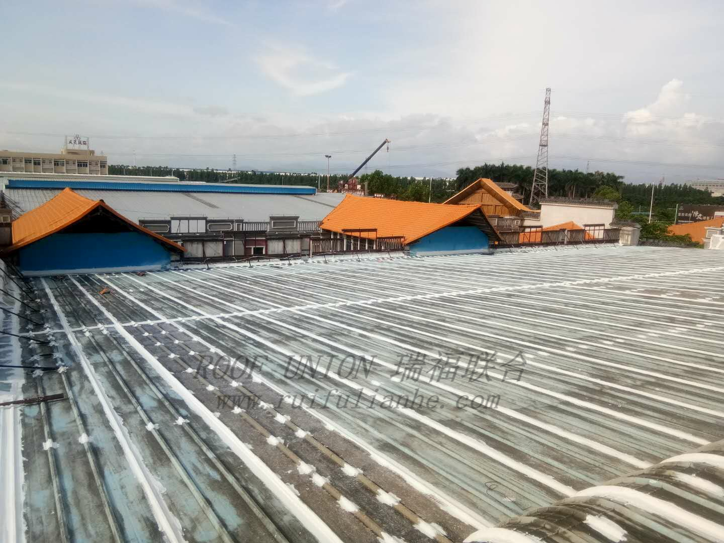 客户生产车间、成品仓库、展示厅均为金属屋面,长年使用后经受多次台风影响,目前金属屋面厂房多处出现渗漏水,已影响日常生产。 虽然有采取局部防水修补,但效果甚微,为了彻底解决屋面渗漏水对生产和运营的影响,客户决定采用瑞福联合“四涂一布”防水工艺进行整体修复。
