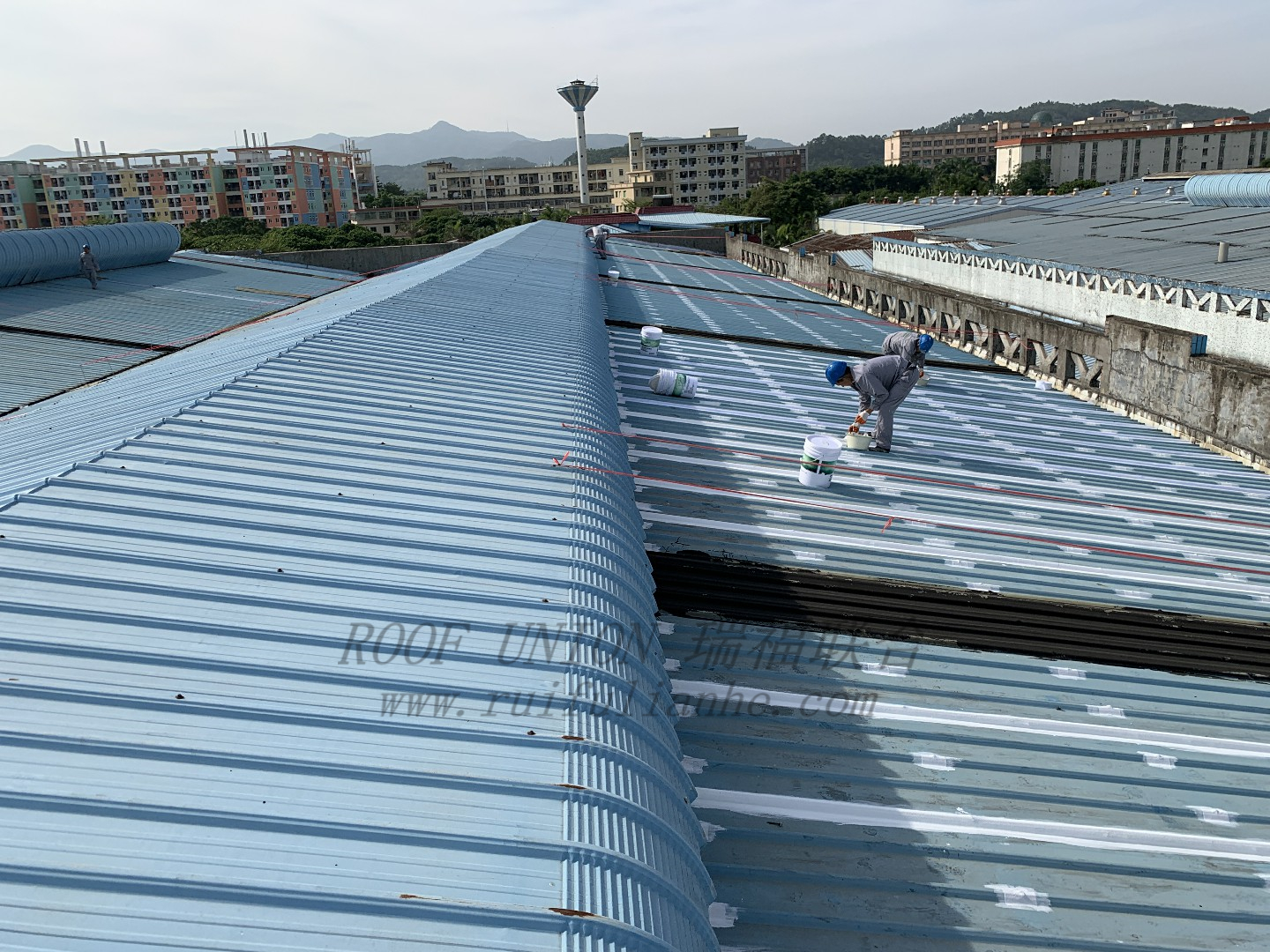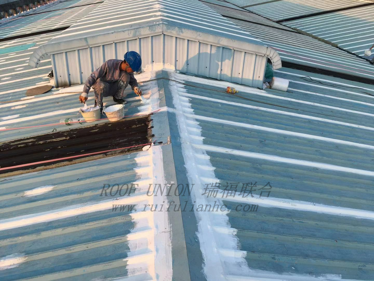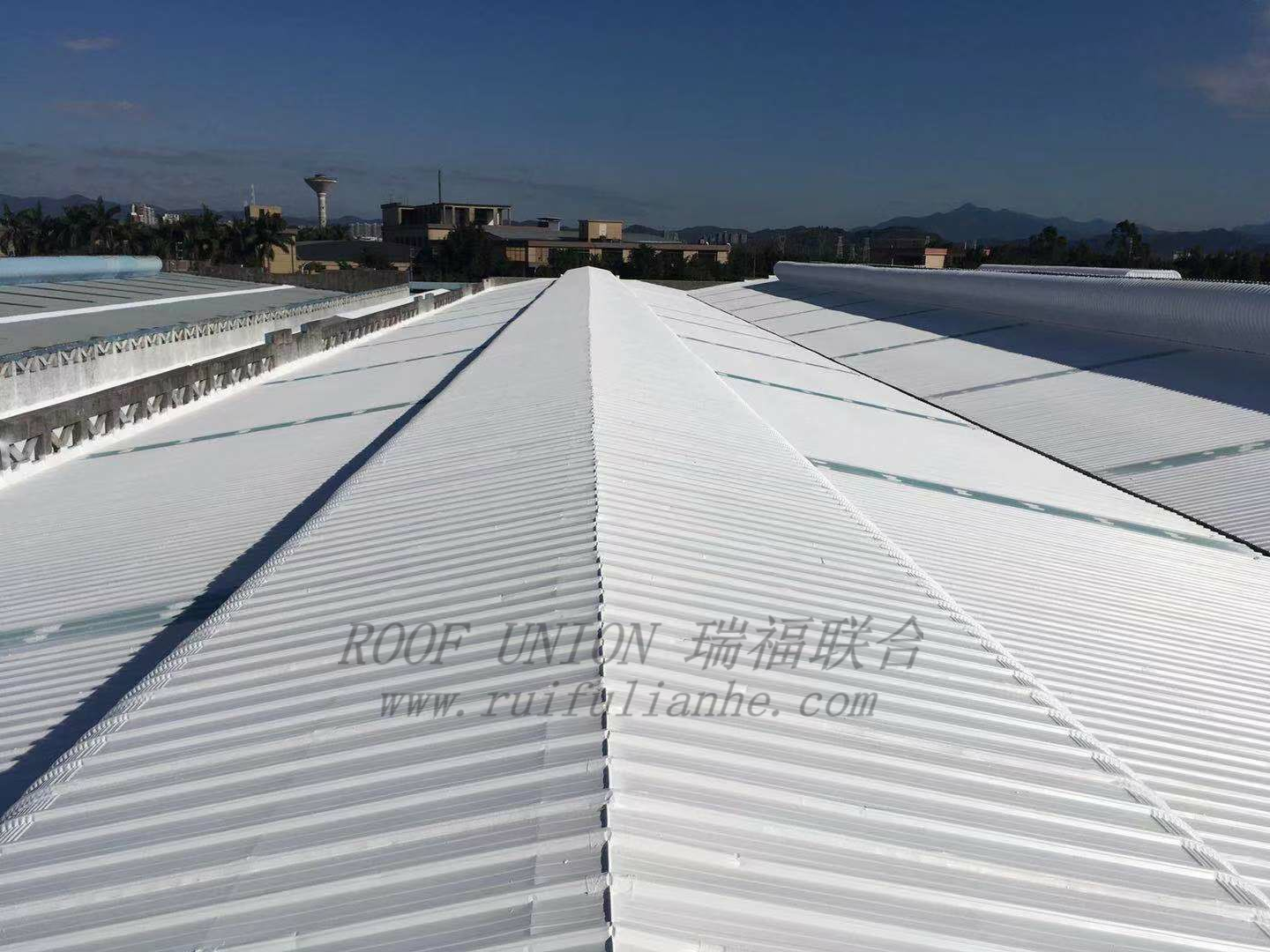 防水修缮工程采用翻新+防治的办法。屋面采光窗、锈蚀天沟、排水管、大面积破损处,全部用新材料进行替换,确保钢结构屋面整体安全性;纵接缝、横接缝、螺钉、屋檐等漏水严重部位,采用瑞福联合“四涂一布”防水工艺进行整体防水,最终达到标本兼治的效果。