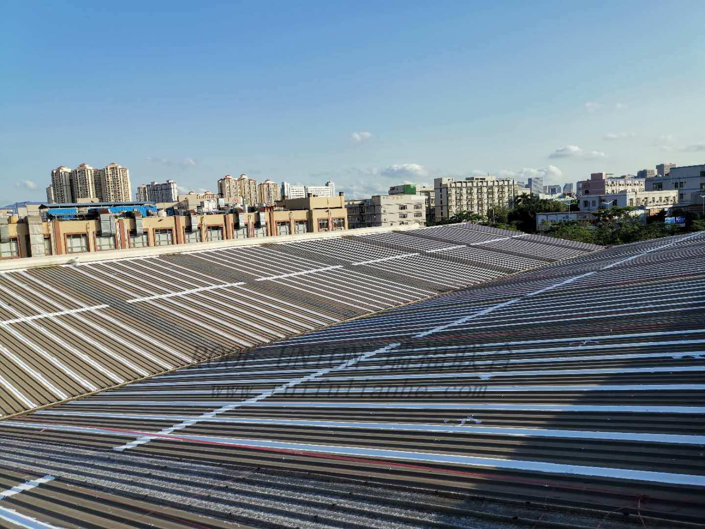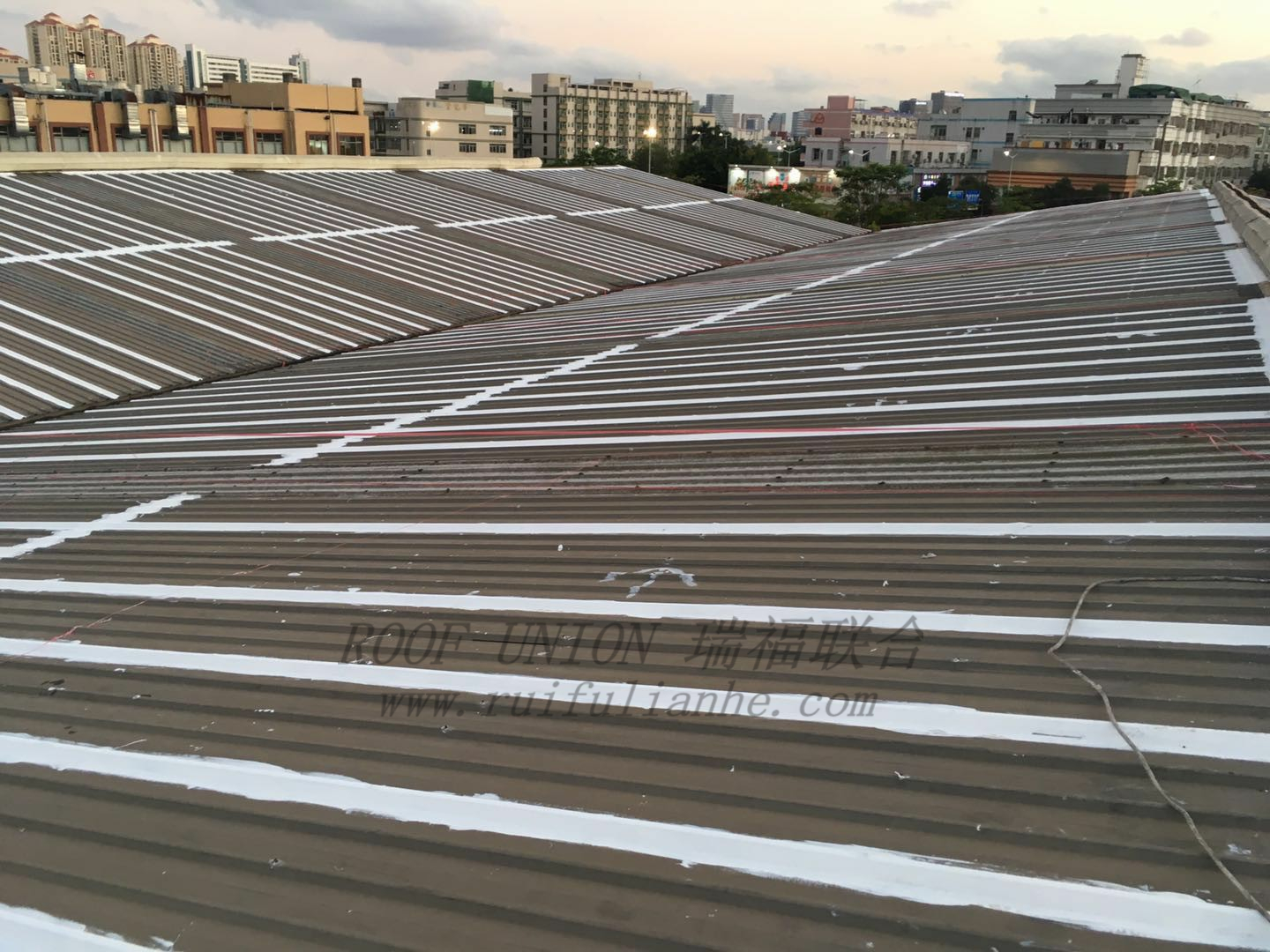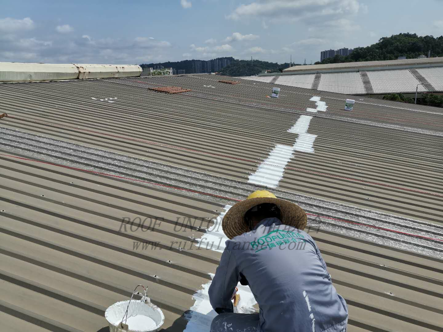 我公司工程人员在屋面勘查时发现:客户厂区内所有生产车间均为金属屋面,经过多年使用后多处出现渗漏水,金属屋面板在夏季时表面温度可达70°以上,长期的高温导致原有防水材料粘接性能下降,长此以往防水材料容易开裂、脱落,导致多处渗漏水严重。且后续并未做任何二次防水处理,基本丧失防水功能。雨水直接渗漏,长期渗透水将影响建筑物的使用寿命及影响企业日常运营,经过我公司的技术人员勘察,实施如下防水“四涂一布”解决方案: