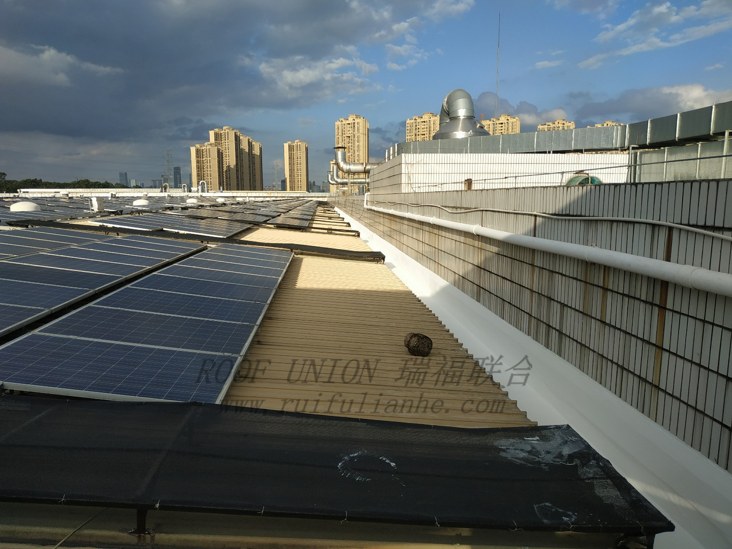 由于屋面排水沟施工作业面有限,天沟的深度又达到40公分以上,为确保将防水层铺设完整,瑞福联合施工团队全程匍匐在屋面上施工。烈日炎炎,屋面板温度高达60度,施工团队不得不将纸箱铺在身下进行隔热。局部特别难施工的排水沟,施工人员甚至要将头部下探到排水沟内,施工难度已经达到极限。