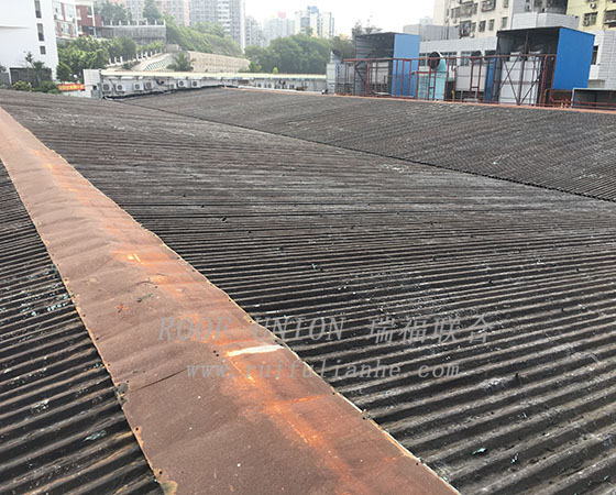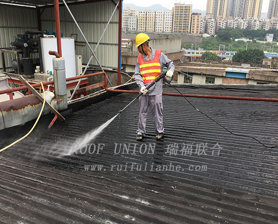 2017年3月份,联合水产公司再次联系到瑞福联合公司,原防水工艺已经失败,厂房屋面多处渗漏雨水,严重影响到公司的日常生产运营。我公司经过多次现场勘查,并在客户厂房屋面制作工程样板,向客户展示瑞福联合独特防水施工工艺。联合水产公司历时2个月,经过多家防水工程公司招投标后,最后确定与瑞福联合公司进行合作,将铺有沥青卷材的3900平方米彩钢板屋面进行整体防水翻新工程。